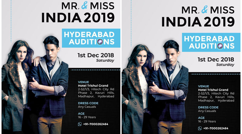 Mr & Miss India 2019 Hyderabad Auditions 1st December 2018 Saturday Venue: Hotel Trishul Grand 2-52/1/3, Hitech city Road, Phase 2, Kavuri Hills, Madhapur, Hyderabad. Dress Code: Any Casuals Age: 16 – 29 years Call: +91 7000262464